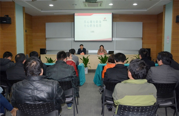 12月26日,開發(fā)公司邀請宿城區(qū)檢察院預防職務犯罪科科長王麗娟作《盡心履行職務,小心職務犯罪》專題講座,園區(qū)黨工委委員、管委會副主任、開發(fā)公司總裁陸志剛參加講座。