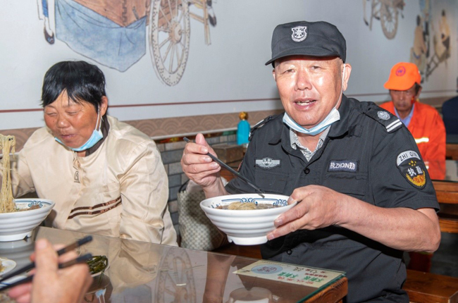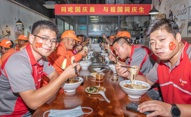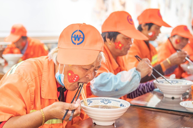 一碗“國慶面”,一份愛國情。當(dāng)一碗碗熱氣騰騰、香氣撲鼻的面條送到環(huán)衛(wèi)工人、快遞小哥等堅(jiān)守在一線崗位上的工作人員手中,大家接過面條,享用著寓意美好的“國慶面”,每個(gè)人的臉上都洋溢著幸福和快樂的笑容。大家用最樸素最平常的食物,表達(dá)了對(duì)祖國母親生日快樂的真摯情感。