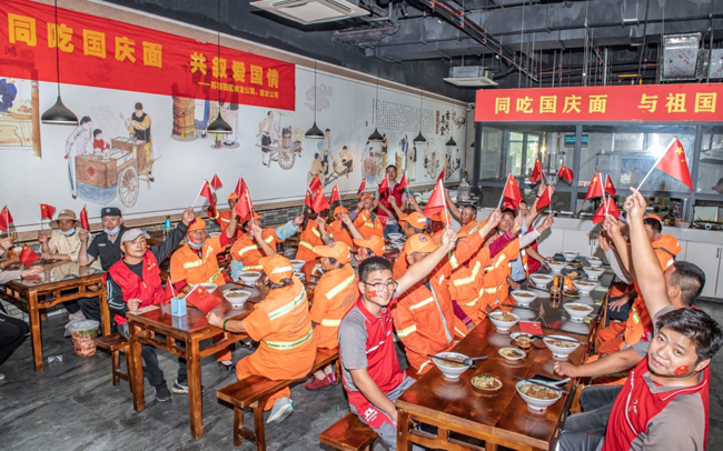 為喜迎中華人民共和國成立73周年,9月30日上午,蘇宿工業(yè)園區(qū)城發(fā)公司、建發(fā)公司在陽澄鄰里中心“陸長興”面館開展“同吃國慶面 共敘愛國情”主題活動(dòng),邀請園區(qū)環(huán)衛(wèi)工人、保安、保潔和快遞小哥代表,以同吃一碗“國慶面”的“新民俗”方式歡度國慶,在歡歌笑語中,敘說家國情懷。