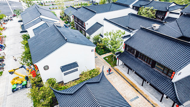 2023年9月25日,蘇宿工業(yè)園區(qū)蘇州街,工人們正在掛燈籠,喜迎中秋、國慶雙節(jié)到來。大紅燈籠與白墻青瓦綠樹相映成趣,成為一道靚麗的風(fēng)景線,營造了歡樂、喜慶、祥和的節(jié)日氛圍。